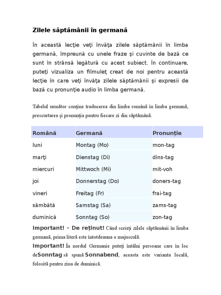 Zilele saptamanii in germana pentru copii. In nordul germanie puteti intalni persoane care in loc de sonntag sa spuna sonnabend aceasta este varianta locala folosita pentru ziua de duminica. Cand scrieti zilele saptamanii in limba germana prima litera este intotdeauna o majuscula. Die tage der woche zilele saptamanii iunie 15 2017 în articole si stiri jocuri de claudiu coman curiozitatatea celor mici este imensa si putem profita de acest lucru pentru a i familiariza pe copii cu notiunea de saptamana si zilele acesteia.